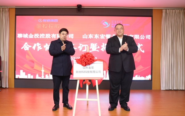 2024年1月9日,山東東宏管業(yè)股份有限公司(以下簡稱“東宏股份”)與聊城市財信投資控股集團有限公司(以下簡稱“財信集團”)舉行框架合作協(xié)議簽訂暨山東金宏新材料科技有限公司(以下簡稱“金宏新材料”)揭牌儀式。